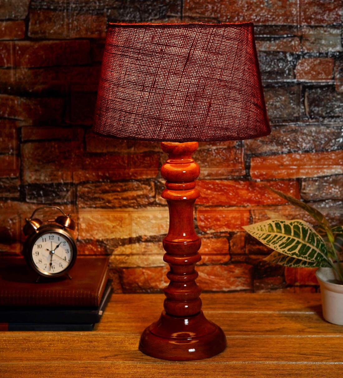 Drax Maroon Natural Fiber Shade Night Lamp With Wood Base