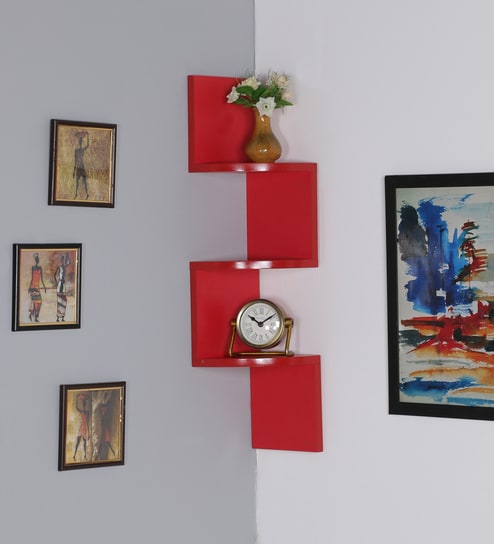 Engineered Wood Zigzag Corner Wall Shelf in Red Colour