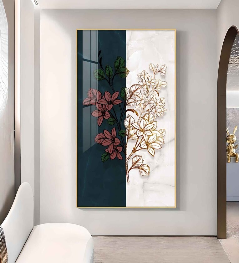 Dual Floral Marble Glass Finish Vertical Wall Art