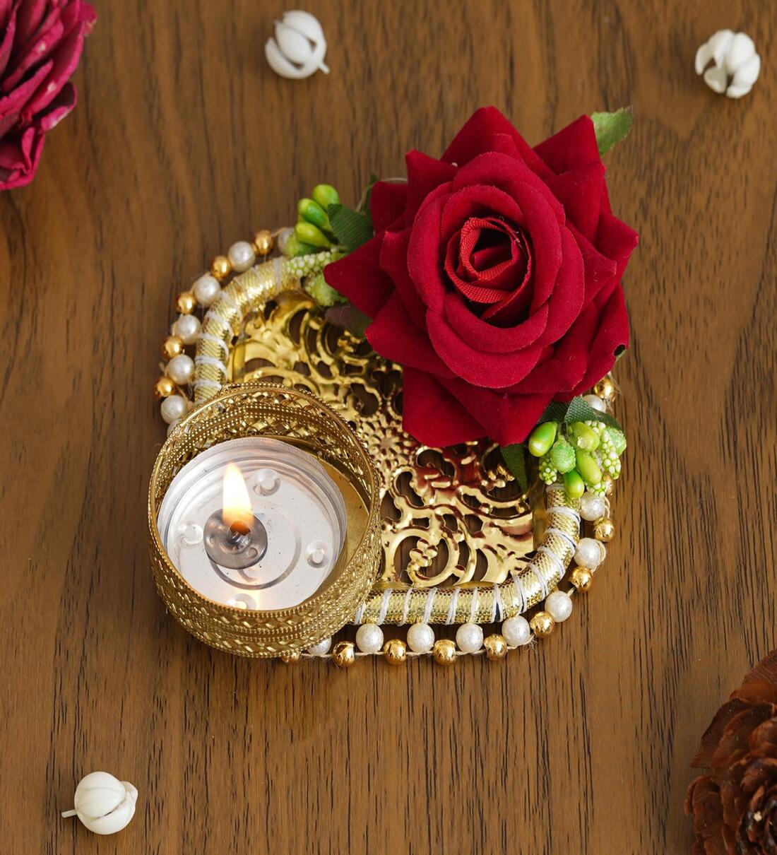 Red Rose Flower and Beads Embellished Handcrafted Decorative Metal Plate Tea Light Candle Holder