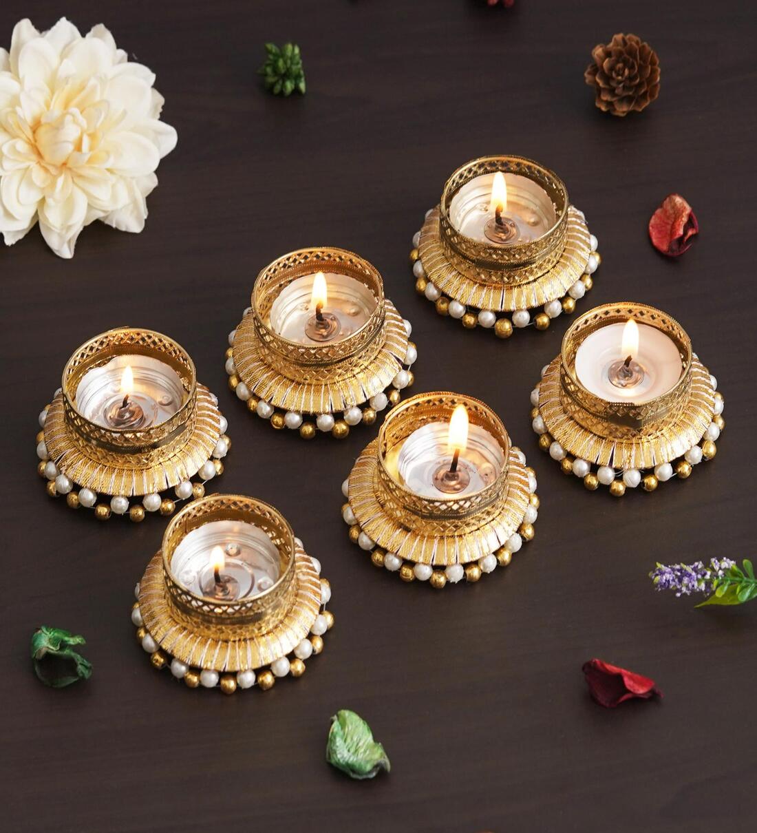 Golden & White Round Shaped Beaded (Set of 6) Decorative Tea Light Holders