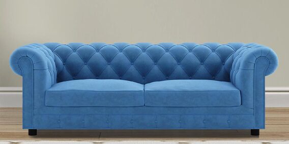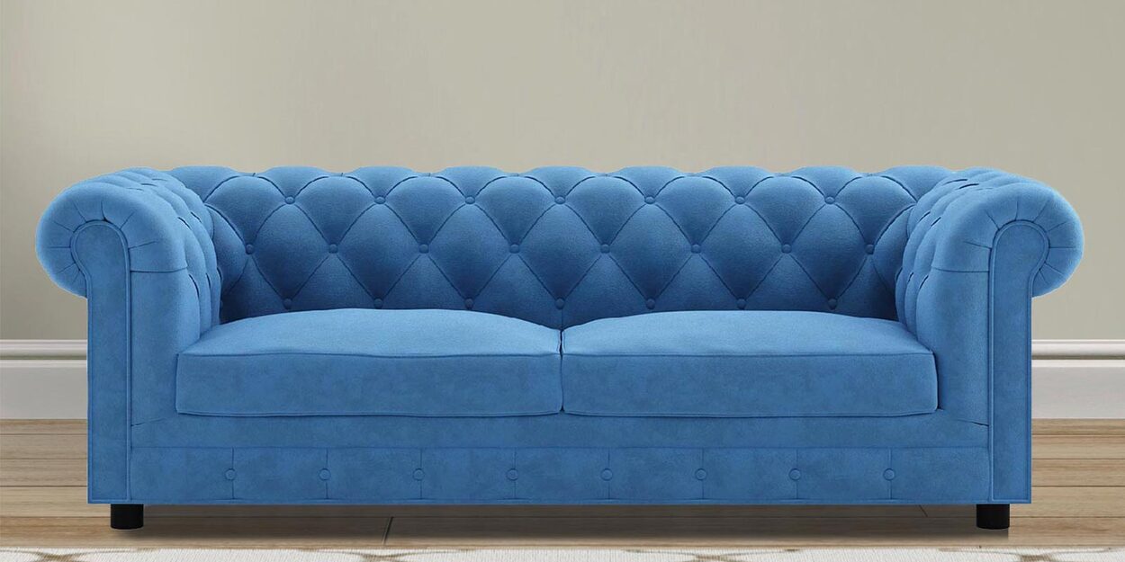 A fresh take on the statement Chesterfield design, upholstered in fabric for a more contemporary feel. In a Royal Blue shade. Large and deep seated, with foam cushioning giving a medium-soft sit. In soft fabric with traditional wooden feet in a velvet finish fabric.