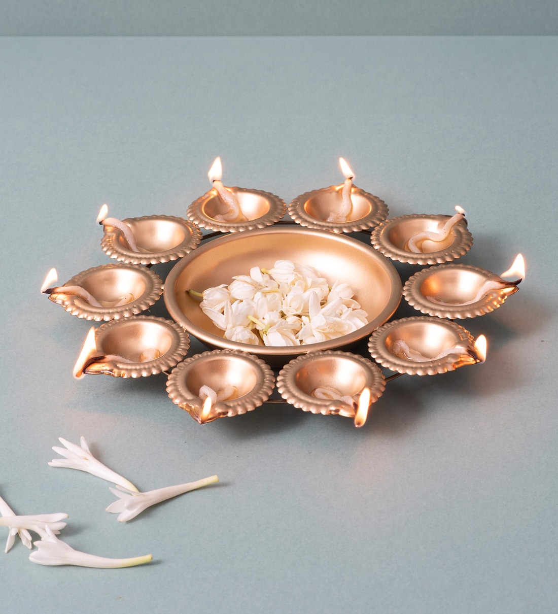 The golden lotus candle holder Urli adds elegance and spirituality to your Diwali celebrations or pooja room. With intricate detailing and a radiant gold finish, it creates a warm, inviting atmosphere.
