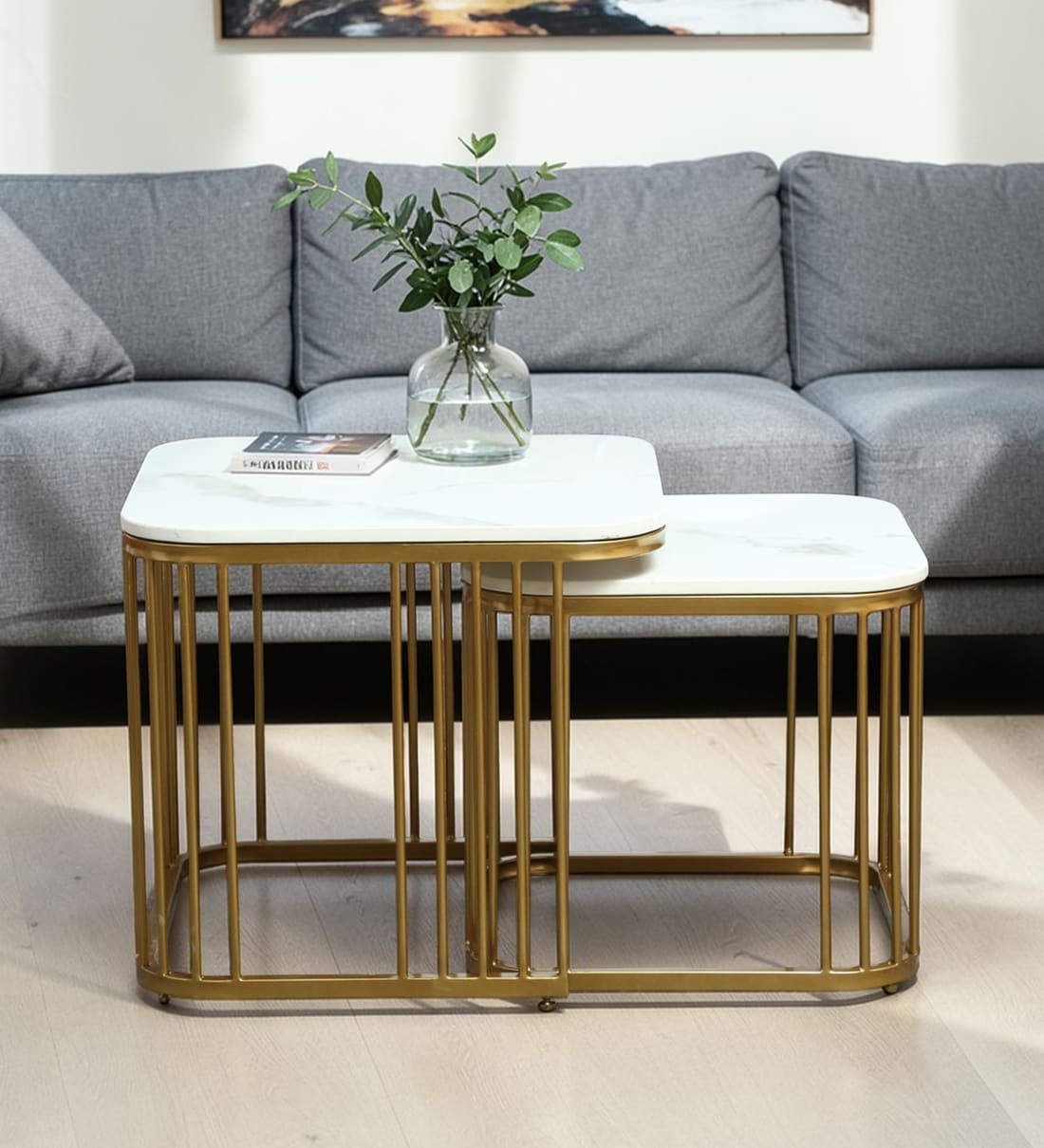 Elvas Metal Nesting Coffee Table Set In Gold Finish with White Porcelain Top (Set of 2)