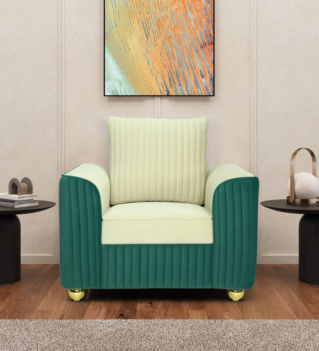 Elysia Waterproof Velvet 1 Seater Sofa In Cream And Emerald Green Colour