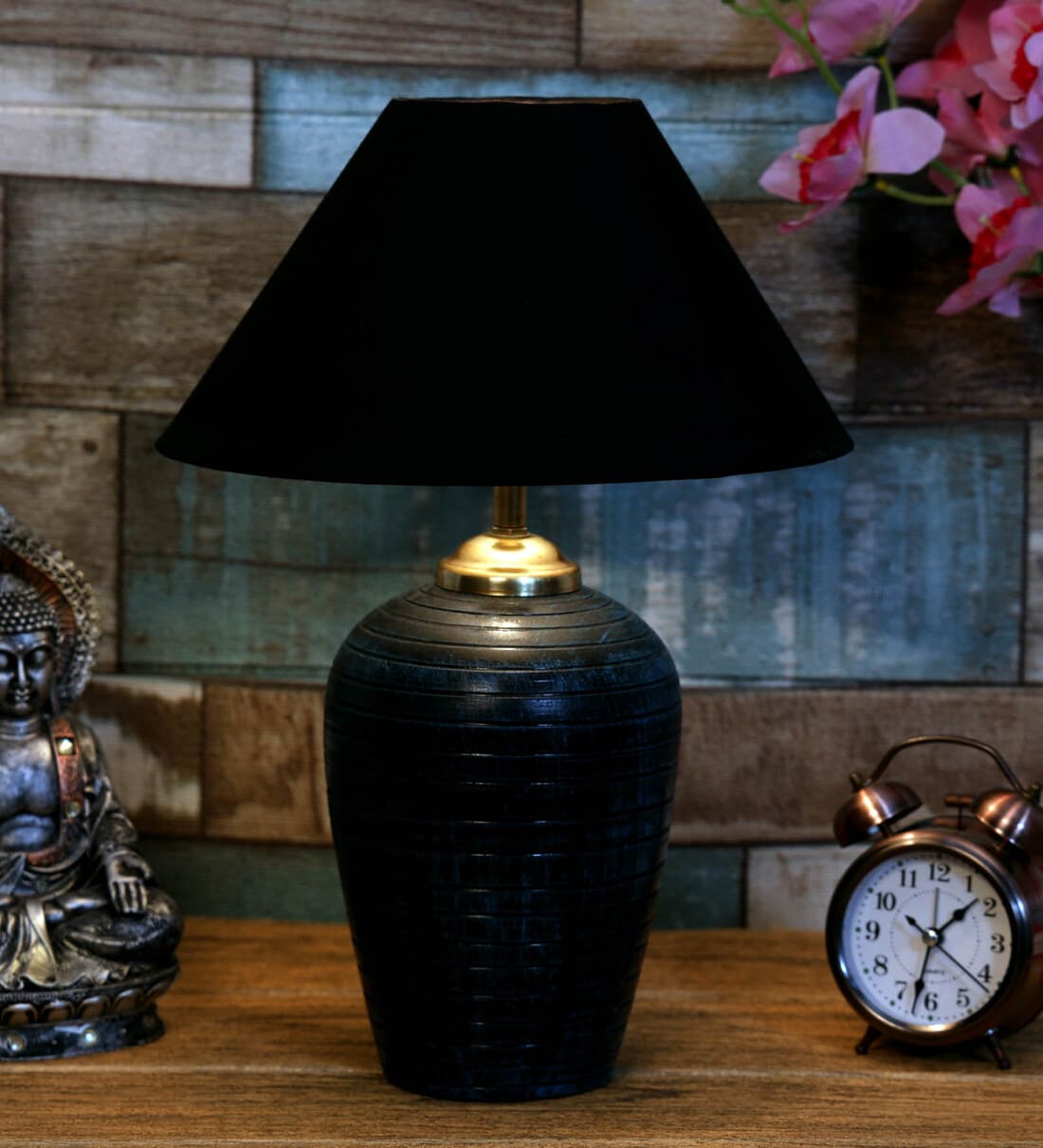 Flemish Black Fabric Shade Night Lamp With Teracotta Base