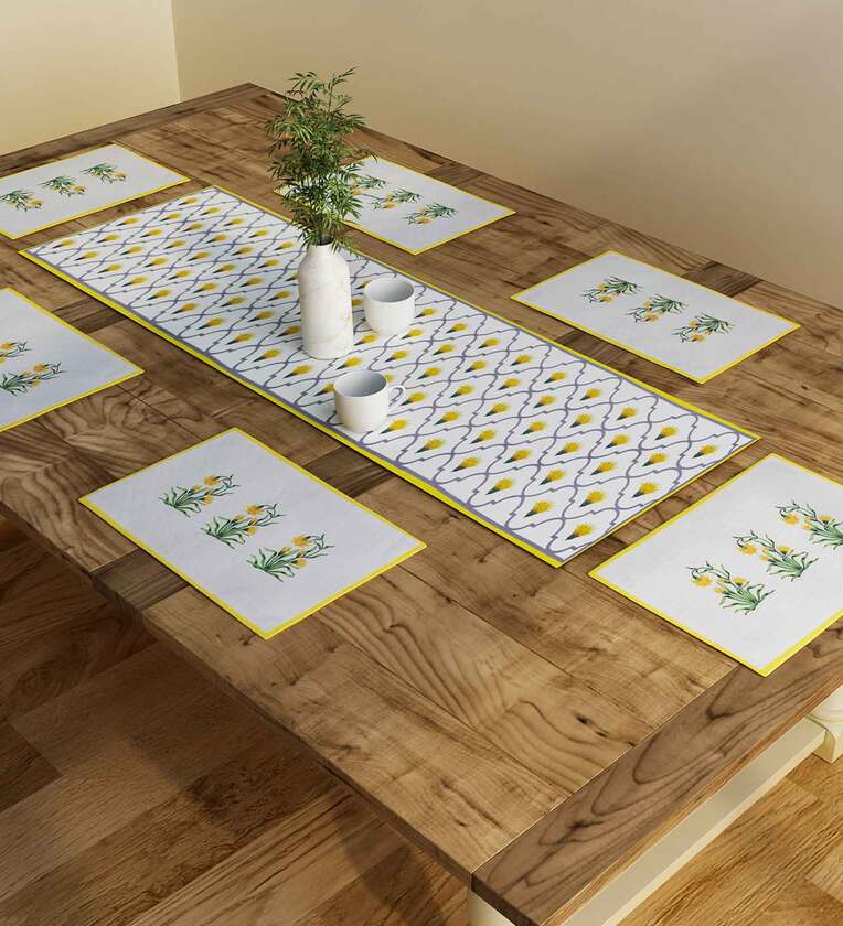 Floral (12x18) Mustard & White Poly Cotton (Set of 6) Table Linen Set