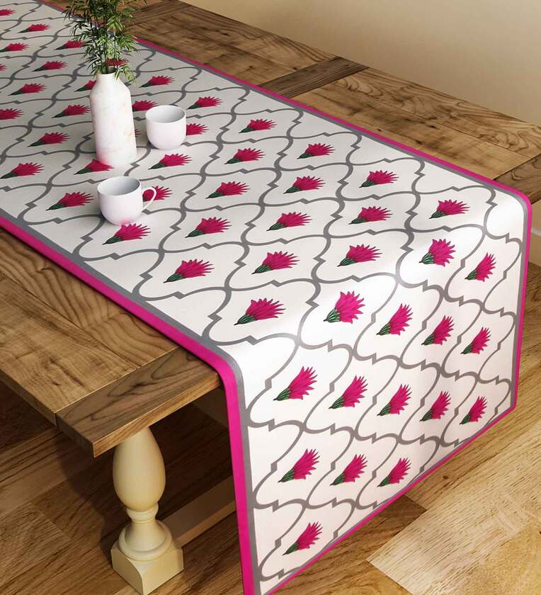 Floral (78x12) White & Pink Poly Cotton Table Runner