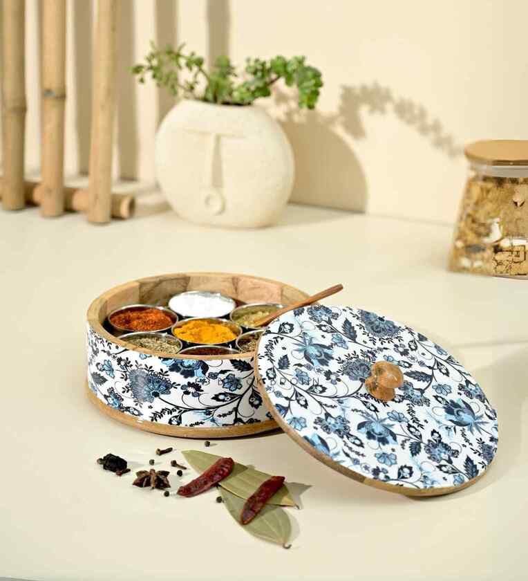 High-Quality Materials: Immerse your kitchen in sophistication with the Floral Masala Box. Crafted from solid mango wood, its premium food-safe finish ensures durability and aesthetic appeal. Stainless steel spice containers guarantee hygiene and practicality. Craftsmanship: Handcrafted with precision by skilled artisans, the Floral Masala Box showcases meticulous craftsmanship. Every curve and detail in solid mango wood reflects a dedication to both form and function. Design and Style: Adorned with a captivating blue floral print, the Floral Masala Box brings a touch of nature indoors. Its design is a harmonious blend of elegance and functionality, enhancing the aesthetic of your kitchen. Functionality: Organize your spices effortlessly with seven removable stainless steel containers, making spice storage and retrieval a breeze. The Floral Masala Box is designed for practicality, adding ease and efficiency to your culinary experience. Maintenance and Care: Preserving the timeless beauty of this spice box is simple. A soft cloth or occasional rub with edible oil keeps the mango wood aging gracefully. The stainless steel containers offer easy washability, ensuring longevity and convenience. No Assembly Required: Embrace immediate functionality�no assembly needed. Unbox this handcrafted marvel to transform your kitchen into a realm of style and culinary efficiency.