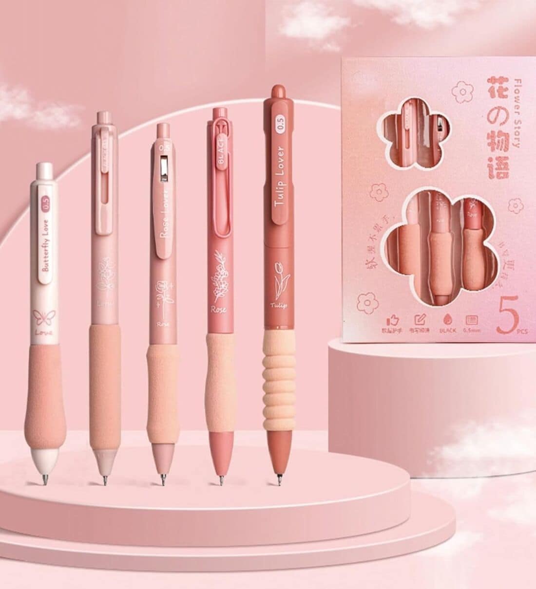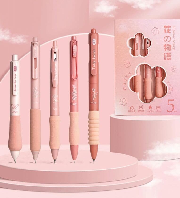 Floral Theme Gel Pens Soft Grip Set of 5 Blue Ink (0.5mm)