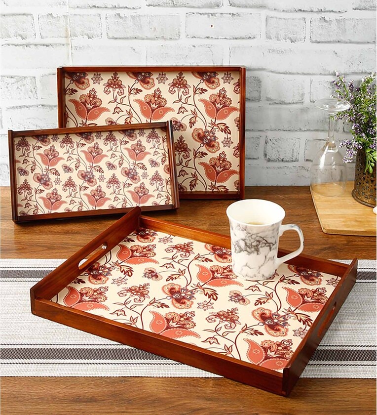 There is a royal exterior design which can match your surrounding and has a premium look and colour.Small, Medium & Large Sized Boat Shaped Rectangular Serving Tray of which Frame is made of Teak wood, Base is made of MDF with Digital Print which can be used at Home, Office Etc.Can be used to serve Tea, Coffee, Water, Snacks, Beverages, Etc. Another way to use a serving tray is by keeping items well organized for example on a Dressing table, console and/or Dinning table