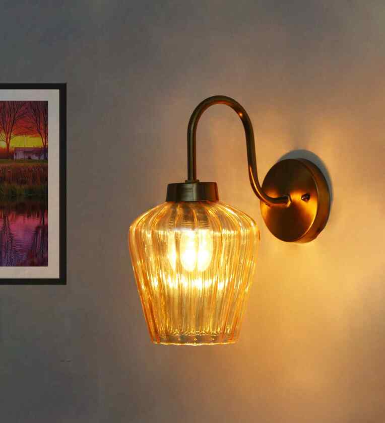 Add a warm, inviting glow to your interiors with this Fluted Gold Down Tulip Shape Brass Wall Light with E27 Holder, thoughtfully designed to blend modern style with timeless appeal. Featuring a softly curved metal arm in a brushed brass finish, this wall light brings a refined, decorative touch to any space. The ribbed amber glass shade enhances the visual depth of the fixture while gently diffusing light to create a cozy, ambient atmosphere.