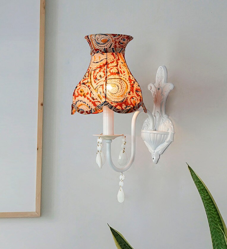 Fos Lighitng White Wall Sconce with Kalamkari Shade and Crystals