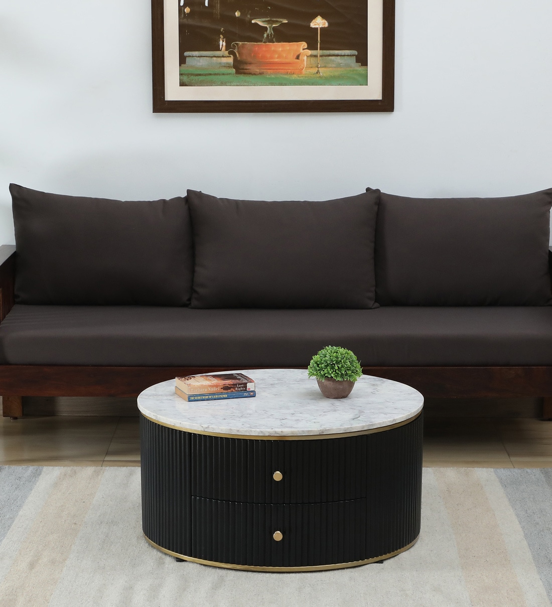 Teran Mango Wood Round Coffee Table In Black Duco Paint Finish With White Marble Top