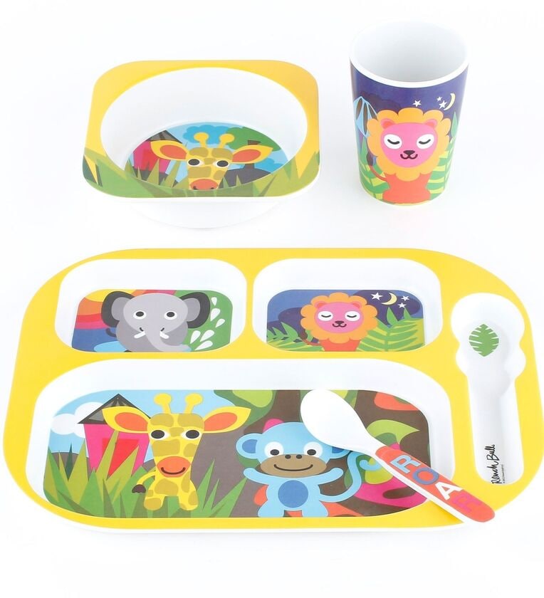 Beautifully packaged 4 piece kid's meal time set in our Jungledesign. The set includes a divided plate with 5 compartments which comes in handy for picky eaters. The spoon, 8 oz. juice cup and rimmed bowl fill out the set.Features:High-grade, glazed melamine plate is scratch and shatter resistant, non-absorbent, and BPA-free.Fun and engaging for kids. Compartmentalize their favorite foods.Dishwasher safe, hand wash recommended. Do not use in the microwave.Includes one tray with utensil, one bowl, and one cup.____________________Meet The Jungle Animals: Roar like a lion. Climb like a monkey. Grow like a giraffe. Be strong like an elephant. The jungle buddies are here to play!