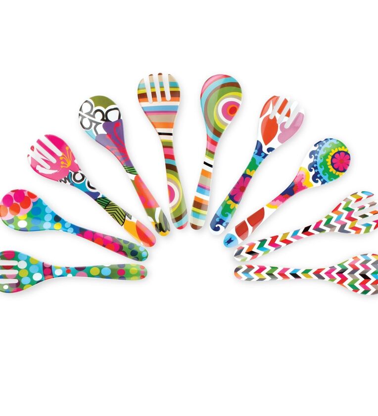 The rounded handle feels good in your hands and the forked and smooth spoon make it easy to grab greens and veggies This item is a museum store favorite that also makes a beautiful gift when paired with a coordinating serving platter or salad bowl. Live Vivid!Features:High-grade, glazed melamine plate is scratch and shatter resistant, non-absorbent, and BPA-free.Perfect for serving salads, pasta, and more. Use for indoor and outdoor entertaining.Dishwasher safe, hand wash recommended. Do not use in the microwave.Measurements: 13.0"L x 3.5"W x 0.6"H. 13-inch length, set of 2; please note that each salad server design may vary____________________About ZiggyZiggy is an Iconic French Bull pattern that epitomizes the brand's passion for color relationships and its modern aesthetic. Ziggy's optical illusions make every look feel like you are seeing it for the first time.