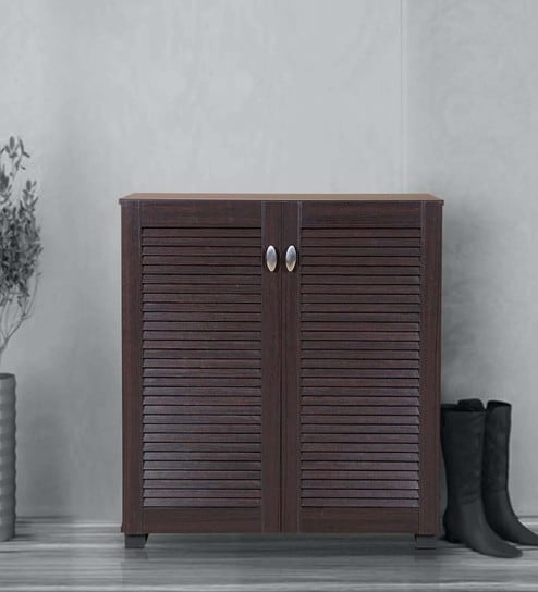 The wenge shoe rack finished with natural wood grain texture has rounded metallic knobs to the doors with French louvre shutters elevating the design style quotient of the unit