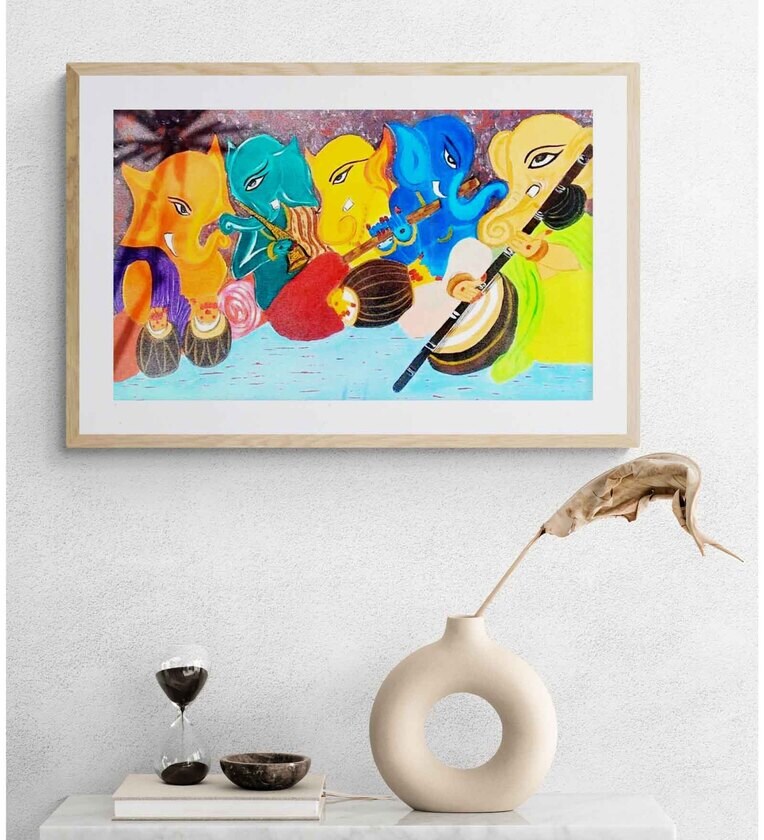Add meaning to your home & workspace with Atypical Art. Vibrant strokes depict Lord Ganesha amidst celestial hues, his divine form resonating with musical essence. Multiple arms gracefully wield traditional instruments, evoking rhythm and harmony. Flowers cascade around him, symbolizing creativity and auspicious beginnings. The painting exudes joy, inviting viewers into a world where music and spirituality converge with divine grace.What you will receive:- Original Artwork without frame- Certificate of Appreciation for empowering an Artist with Disability (shared over email) Expected delivery time: 7-10 business days
