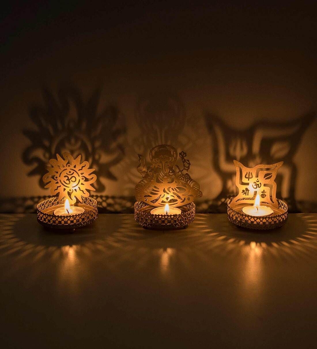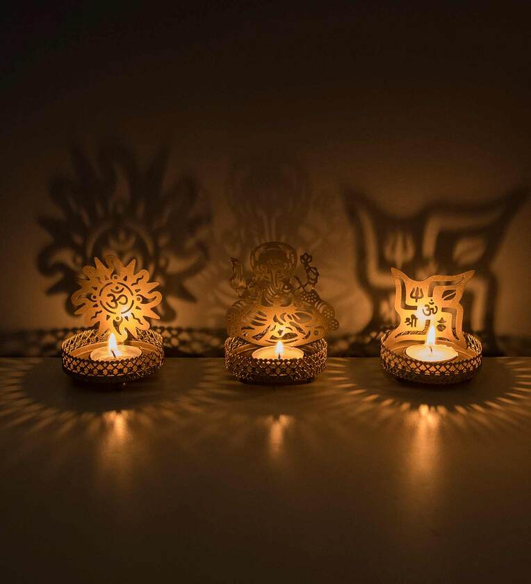 Ganesha, Om & Swastik Metal Table Tea Light Holder (Pack Of 3)