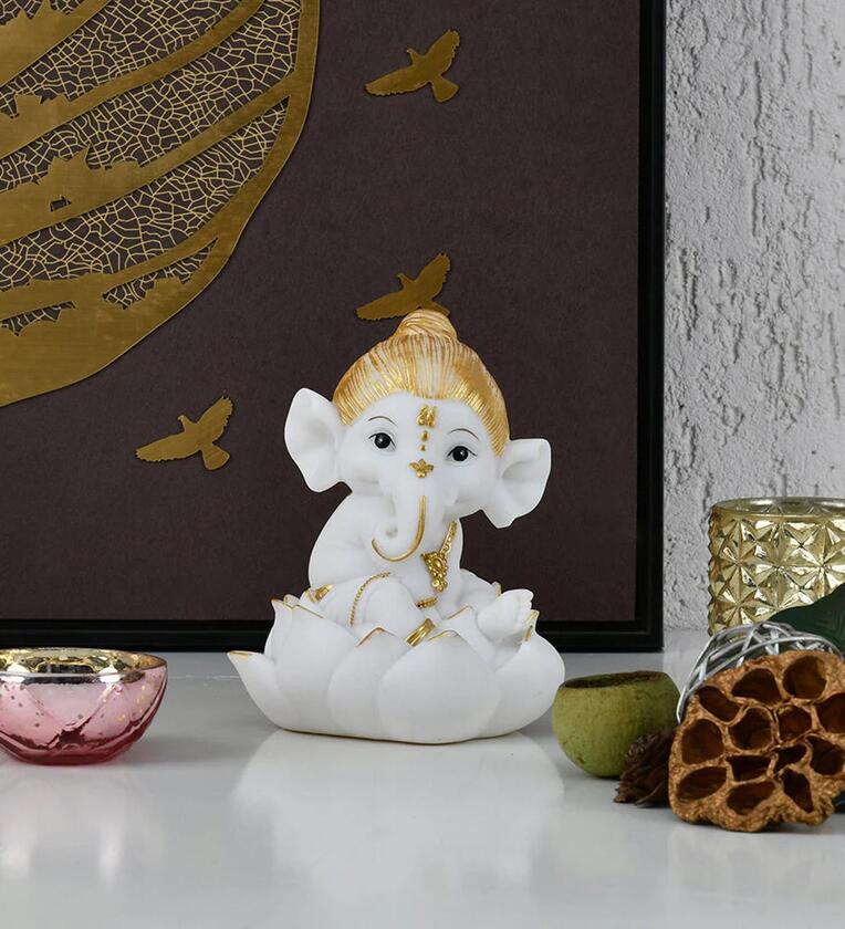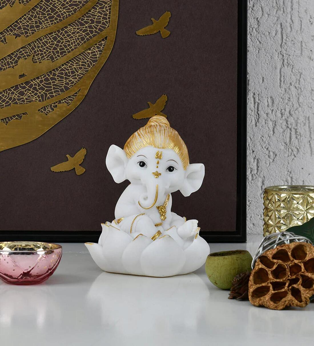 Ganesha On Lotus White & Gold Polyresin Religious Idols