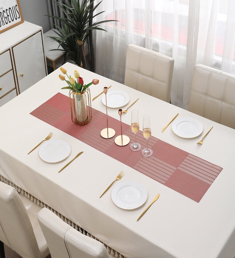 30x135 cm dining table runner. Can also be used as centre table runner or side table runnerQuality Material - This dining table runner is made using blend of 70% PVC and 30% Polyester.Easy to Clean - Simply wash this center table runner with tap water or sponge wipe and it will be clean.Size - This dinner table runner measures 30x135 cm in size.Package Contents - 1 table runner for dining table / centre Table.