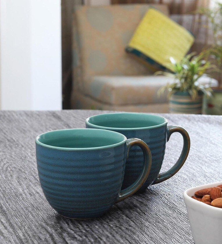 Glazed Pottery Stripe 300ml Green Ceramic (Set of 2) Tea Cup