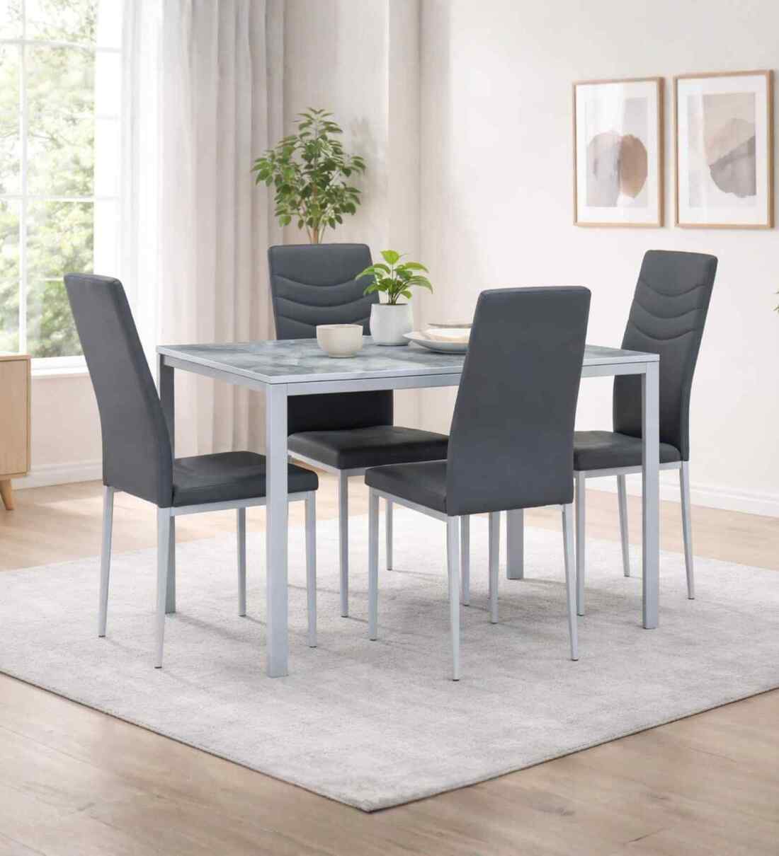 Table: 1. Sintered stone tabletop 2. Scratch-resistant, heat-resistant & stain-resistant surface 3. Sturdy powder-coated metal frame 4. Durable & long lasting 5. Easy-to-clean 6. Strong rectangular tabletop suitable for 4-seater dining Chair: 1. Premium faux leather 2. Soft padded seat for comfortable long sitting 3. Strong metal legs ensuring durability and stability 4. Anti-slip & anti-scratch leg caps to protect flooring 5. Sturdy construction