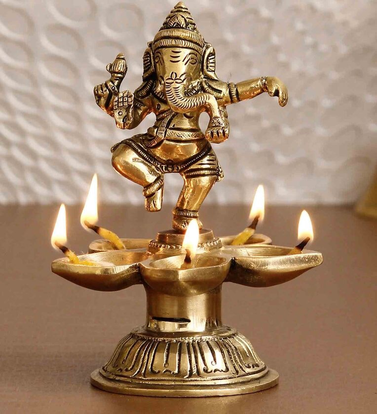 Gold Brass Dancing Lord Ganesha Handcrafted with Diya for 5 Wicks eCraftIndia