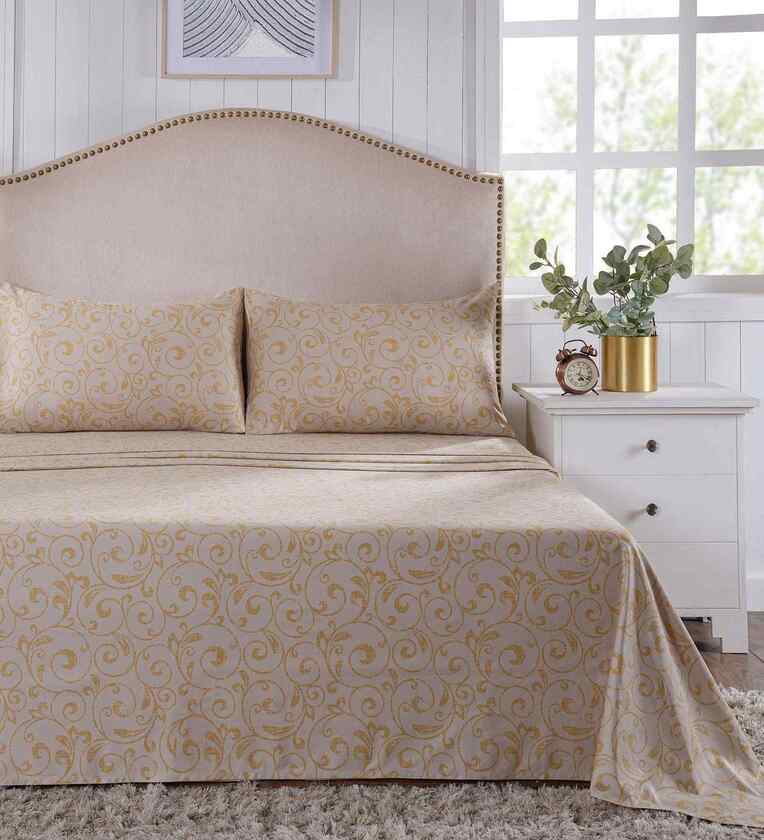 Gold Ethnic Motifs 400 TC Cotton King Size Bed Sheet with 2 Pillow Covers Classical Ornate Collection