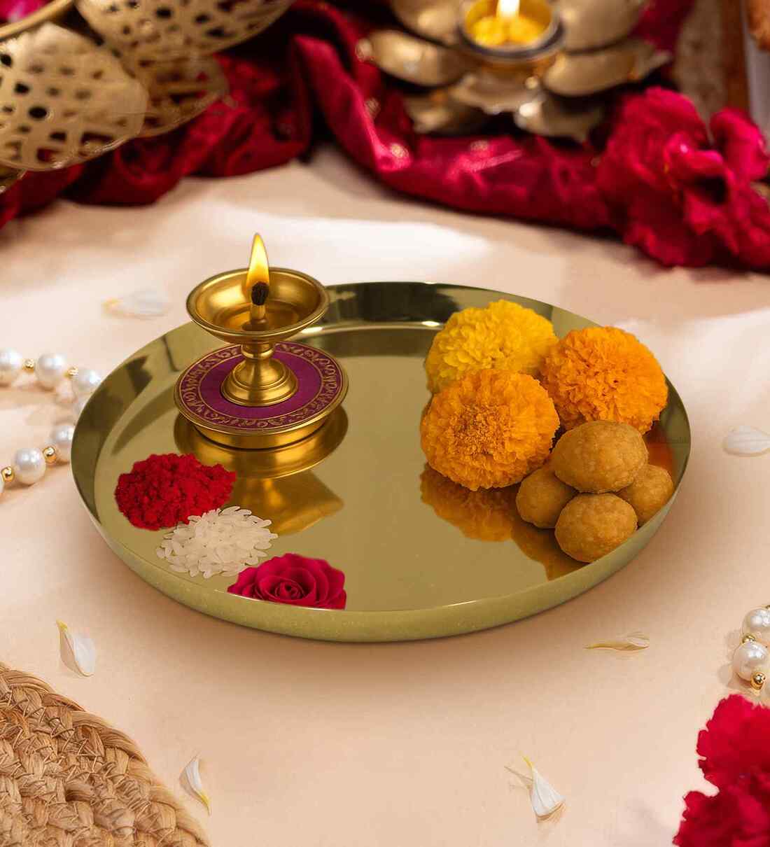 This elegant Metalsmith Steel Pooja Thali is a perfect addition to your home temple, blending traditional purpose with modern design. Crafted from durable steel with a beautiful, sleek Gold finish, this plate features a unique textured surface that adds a touch of sophistication. It is designed to hold all your essential ritual items for worship and festive occasions like Diwali. Beyond its ceremonial use, this versatile Pooja Thali also functions as a stylish piece of home d�cor, serving as a decorative tray for displaying candles, flowers, or other cherished items, bringing a sense of grace and serenity to any space.