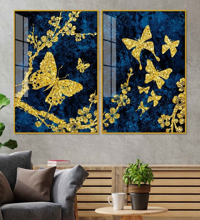 Gold Foil Butterfly Acrylic Art Framed Art Panel (Set Of 2)