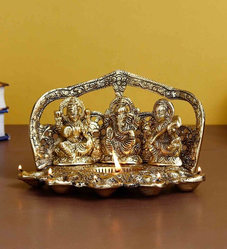 Gold Metal Laxmi Ganesha Saraswati with Diya for 6 Wicks Handcrafted eCraftIndia