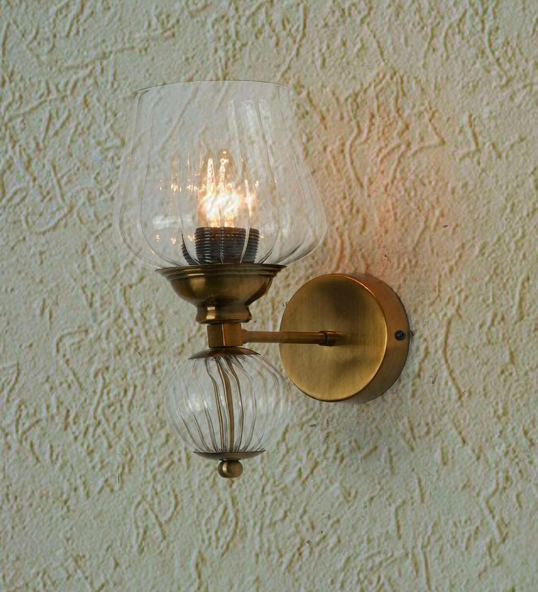 Product Description- Elevate your interior with our Antique Brass Wall Sconce, a transitional masterpiece adorned with a fluted glass goblet diffuser and a charming fluted glass ball accent at the bottom. Crafted from durable mild steel and finished in antique brass, this wall sconce adds a touch of sophistication to your space. The fluted glass goblet diffuser radiates a soft and inviting glow, creating an enchanting ambiance. The unique design features a delightful fluted glass ball, providing a playful and elegant twist to the sconce. This distinctive combination of elements makes it a statement piece that enhances the aesthetics of your room. With its transitional style, this wall sconce effortlessly complements various interior decor themes, from traditional to contemporary. Place it in living areas, hallways, or bedrooms to create a warm and welcoming atmosphere. Illuminate your surroundings with the radiant glow of our Antique Brass Wall Sconce with Fluted Glass Goblet Diffuser and Ball Accent. Embrace the harmonious fusion of classic and modern design, and let this sconce become a captivating centerpiece in your decor.
