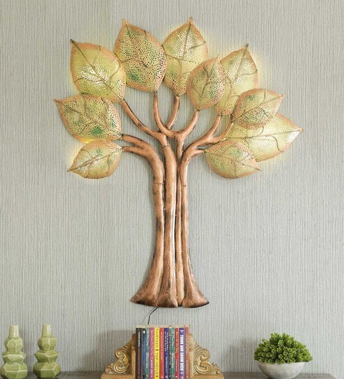 Wrought Iron Decorative Tree Wall Art With LED In Gold