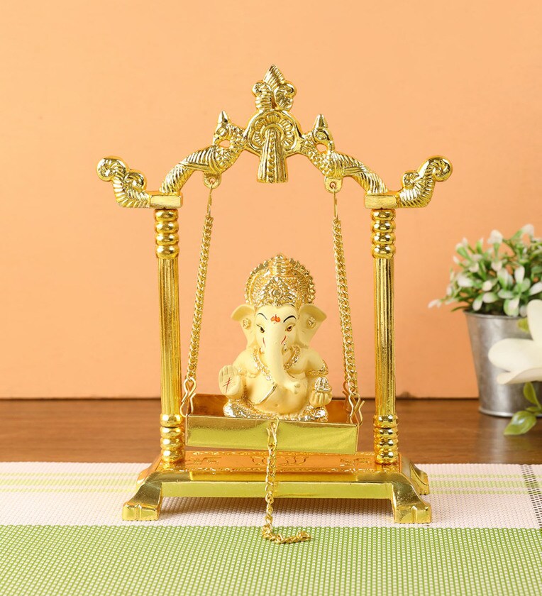 Size of Jhulla: Height 8 Inches x Length 6.5 Inches x Width 2.5 Inches | Weight : 400 Grams | Material: Aluminum with Golden Finish|This is a beautiful, unique & gorgeous hand work on solid metal figure of hindu god Ganesha on Jhulla. Bless your place and heighten the beauty and spirituality of your house or work place with this Handmade God Ganesha Sculpture. Ganesha is the remover of obstacles, the deity whom worshipers first acknowledge when they visit a temple. He is worshipped for success (siddhi) in undertakings and intelligence (buddhi). He is worshipped before any venture is started. He is also the God of education, knowledge and wisdom, literature, and fine arts. Ganesha is the legendary scribe who, using his broken tusk, which he often holds, wrote down parts of the Mahabharata epic.This Handmade God Ganesha Sculpture is fully artisan crafted in India, making it a truly authentic figurine. This Handmade God Ganesha Sculpture is designed in Metal using sand casting technique and has a golden color to it. Place this calm art piece in your living room for an effervescence beauty or gift it to your loved ones before he/she enters a new phase in life. It represents the power of the Supreme Being who removes obstacles and ensures success in human endeavors.Complete the decor of your home in the utmost of style or add some Indian flair to your living room decor.