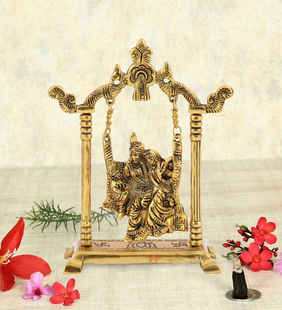 This handcrafted antique idol of Lord Krishna Radha on metal durable stand is made of pure white metal. Radha and Krishna gracefully swinging on a swing . It is carved in beautiful design with nice finishing.The idol is Antique golden finished to give it alluring antique look. Bringing prosperity and happiness to your living space by keeping this Radha krishna It is also an ideal gift for several occasions such as Wedding Gifts, Corporate Gifts, Birthday Gifts, Diwali Gifts, Rakhi Gifts, New Year Gifts and Compliments, etc. A one stop-shop for home decor and furniture, Pepperfry sells a home product every 30 seconds.