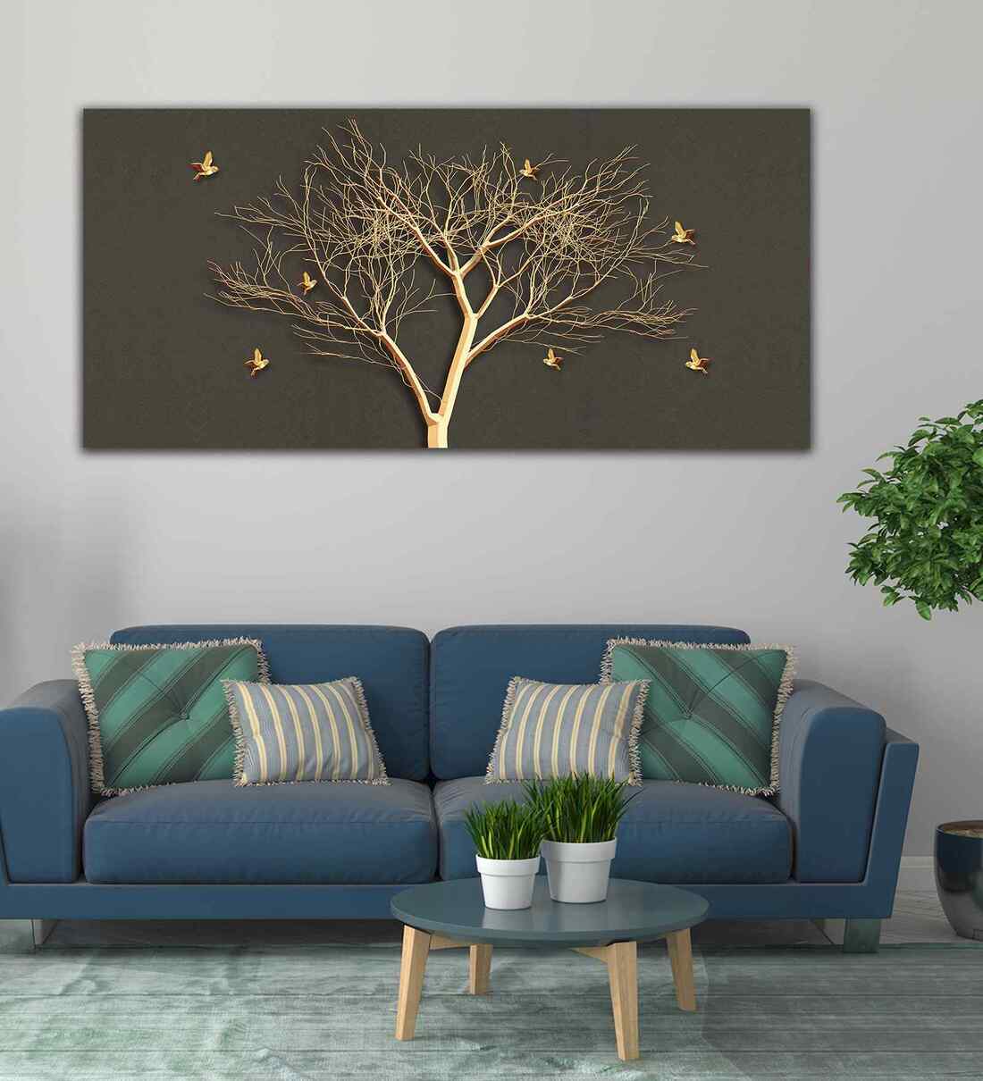 Golden Embossed Tree With Golden Birds Premium Canvas Wall Painting