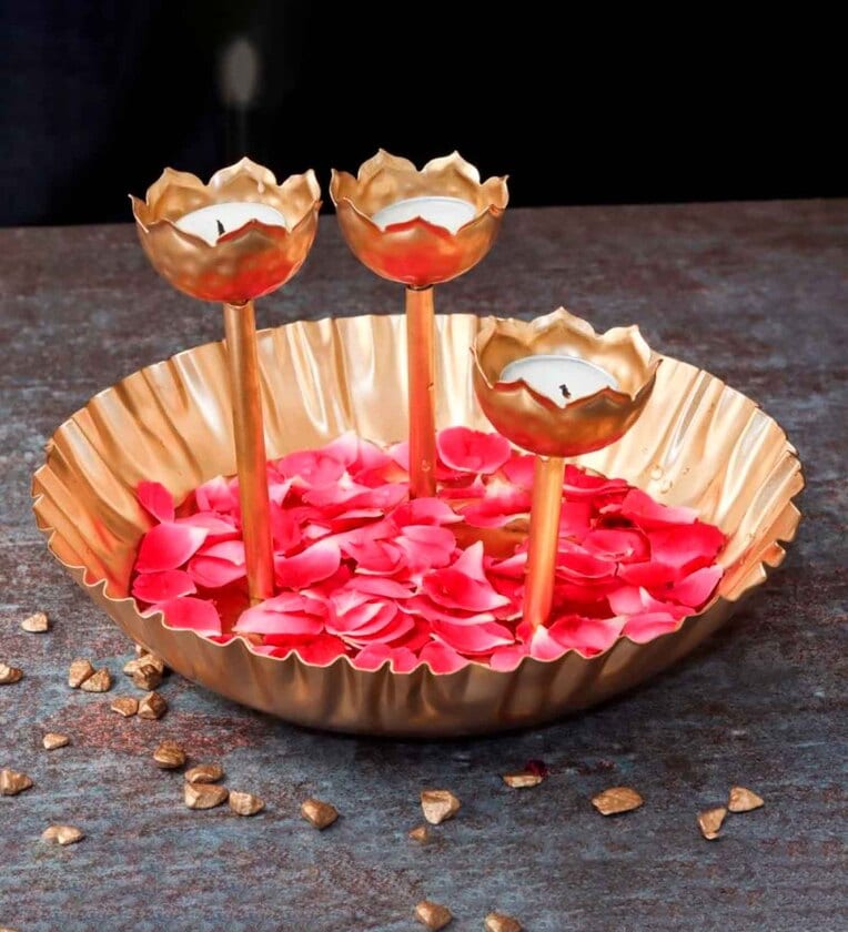 They say water attracts wealth, hence urlis filled with water covered by flowers is regarded auspicious. The look and feel of these metal urlis with with blooming flowers not only match any setting and makes the space look beautiful, they also bring in luck, wealth and prosperity to the entire family as per Vastu. Besides, having a great look and feel in your own home they make the perfect gift for any Indian festive occasion or house warming. This metal urli comes with 3 complimentary wax t - lites. Care instructions - The stands are made of iron so clean with a soft dry cloth.