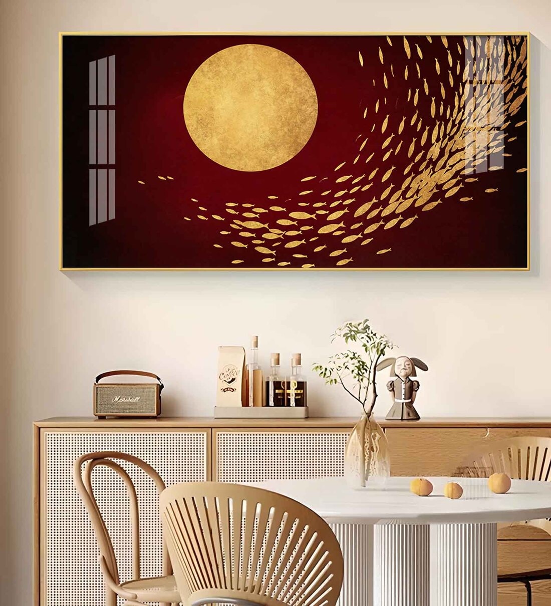Golden Fishes With Red Background Glass Finish Horizontal Wall Art