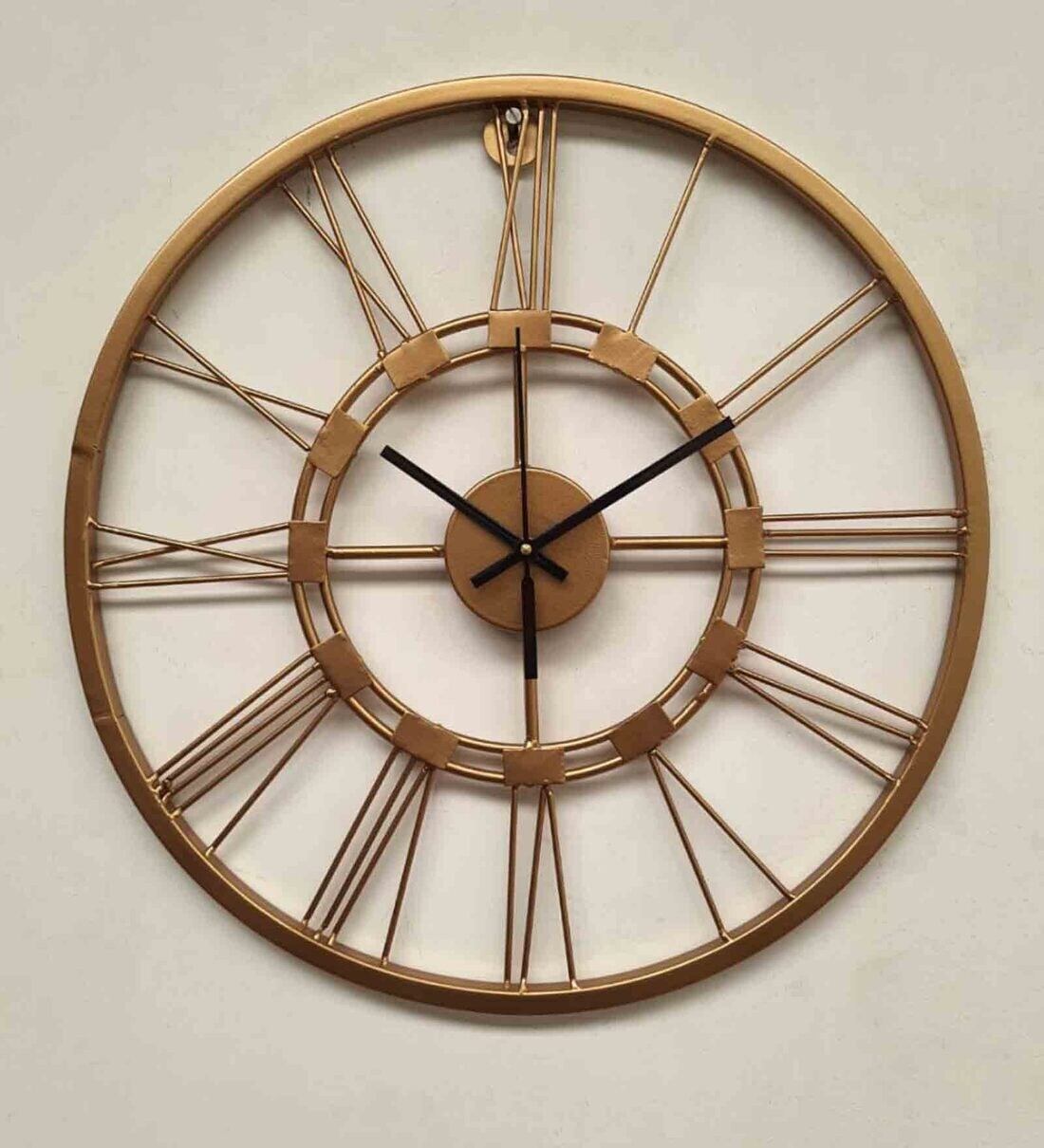 Material : Metal | Diameter : 24 inches | Color : Golden | Design : Transparent Roman Number Clock | Type : Analog Wall mounted Watch | Frame : Solid Metal with Rust free Coating | Shape : Circle | Size : Large / Big | Machine : Quartz | Model : Transparent | Use : Indoor and Outdoor | Blades : 3 for Hour Minute and Seconds | Generation : 3rd Gen Clocks