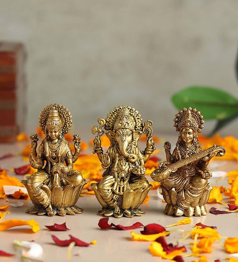 Divine Pooja Idol Set for Home & Mandir: Bring blessings with this Brass Lakshmi, Ganesh & Saraswati Maa Idol Set, a sacred Hindu God Idol, God Murti, and God Statue, perfect for your God Idol for Pooja Room, Pooja Idol, or Mandir Idol.
