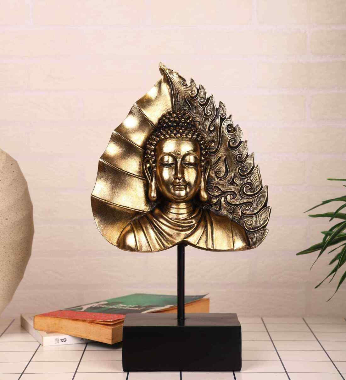 Add a touch of peace and elegance to your d cor with this exquisite golden resin artefact featuring Tathagata Gautama Buddha seated on a beautifully crafted Ficus leaf. One side of the leaf showcases a smooth finish, while the other displays an intricate design, making it a unique and eye-catching piece.