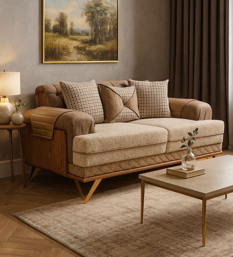 The GrandLuxe Two-Seater Sofa combines soft fabric, quilted leatherette, and polished wood panels for a timeless design.