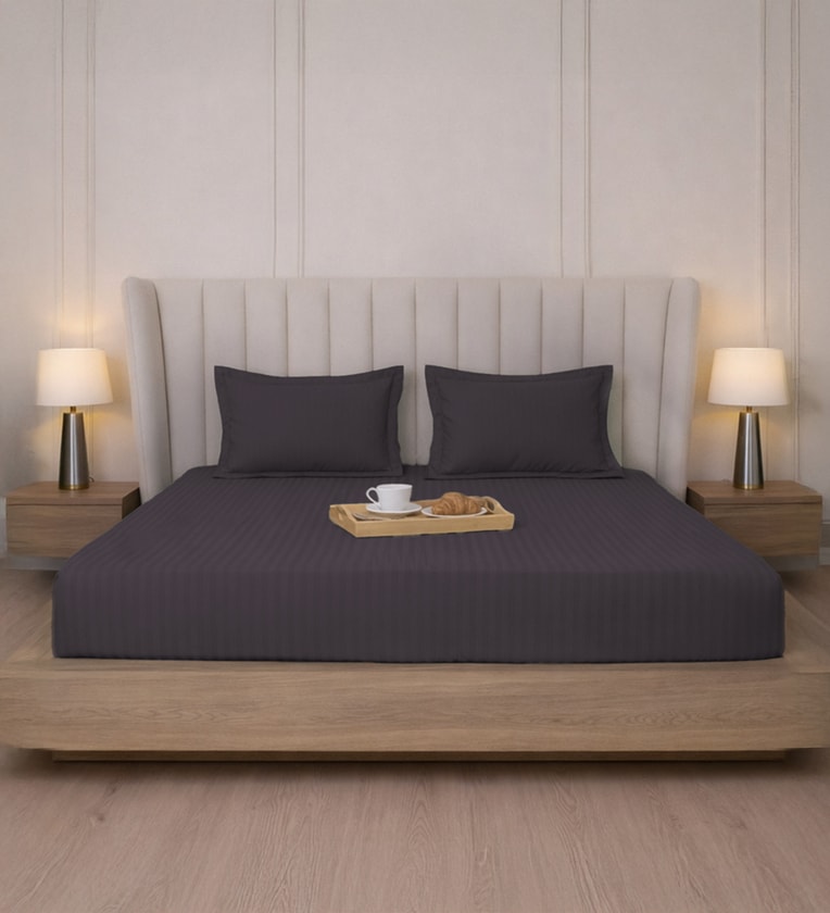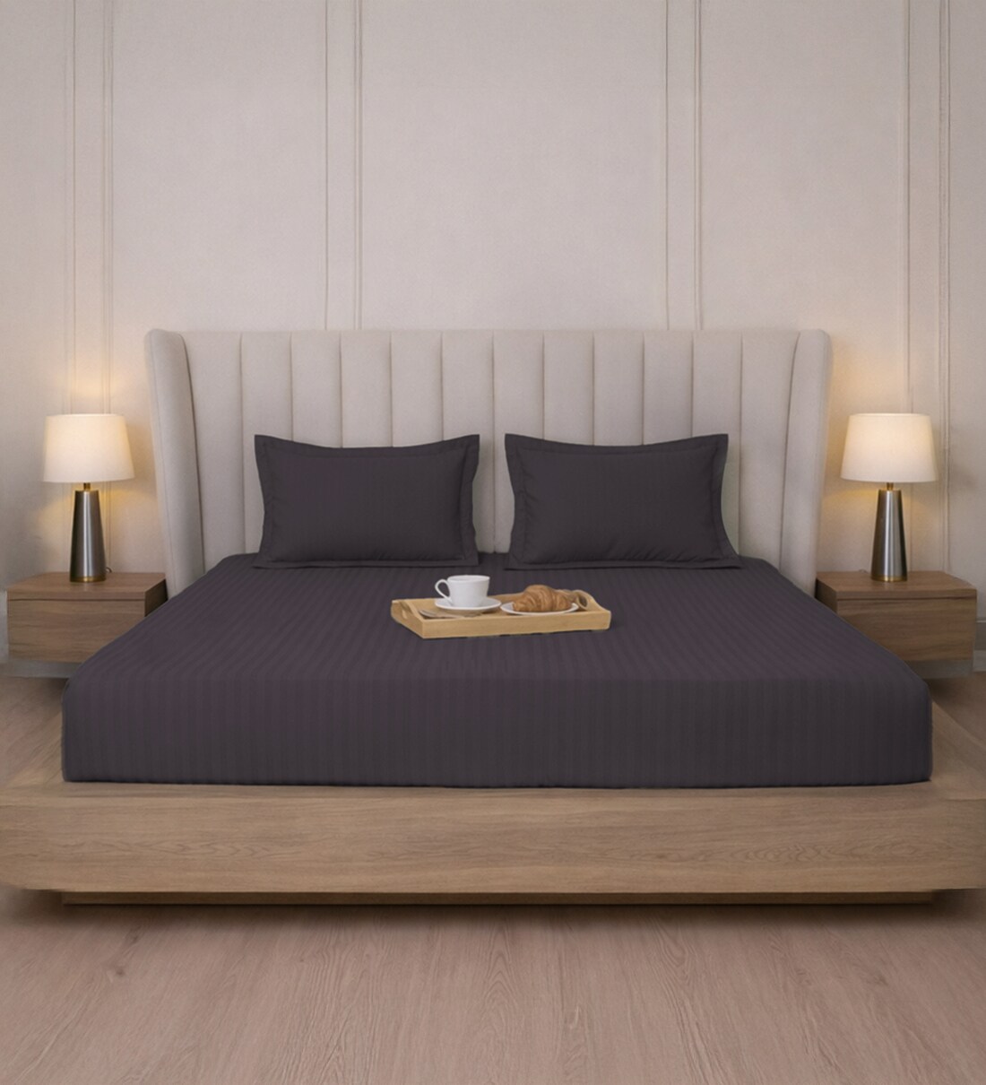 Granite Gray Stripe 300 TC Pure Cotton King Fitted Bedsheet with 2 Pillow Covers