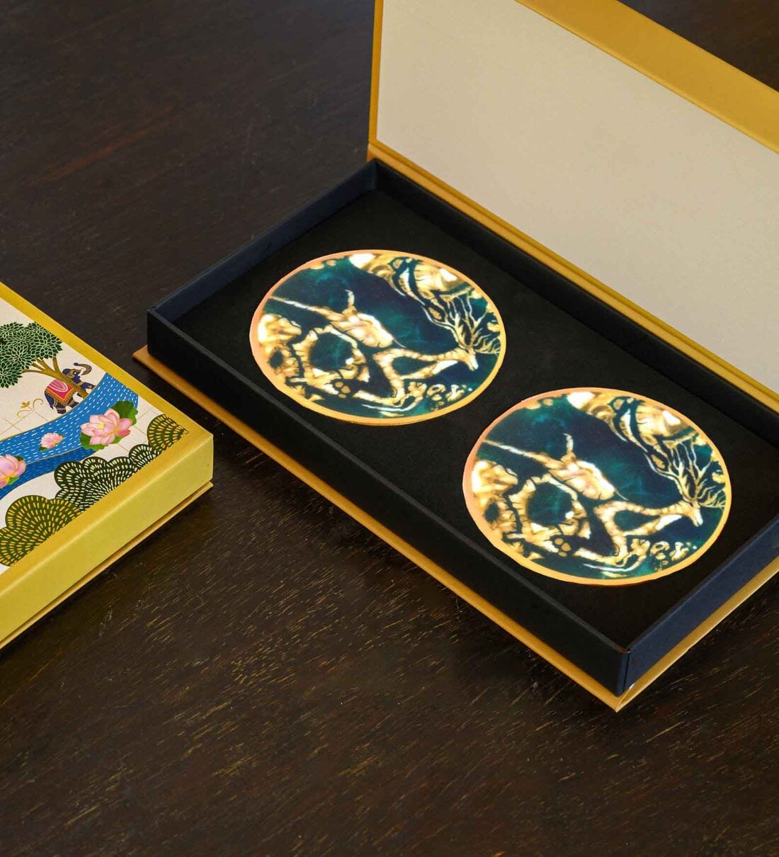 In our unique artwork, titled "Let them Fawn over," we draw inspiration from Odisha's deep reverence for the Sambar deer, its state animal. Sadly, due to extensive exploitation and hunting, this species is now part of the IUCN Red List, with Odisha being one of its few remaining habitats. Our captivating coaster artfully combines an aerial view where the land gracefully transforms into the majestic form of a Sambar deer, surrounded by serene waters.