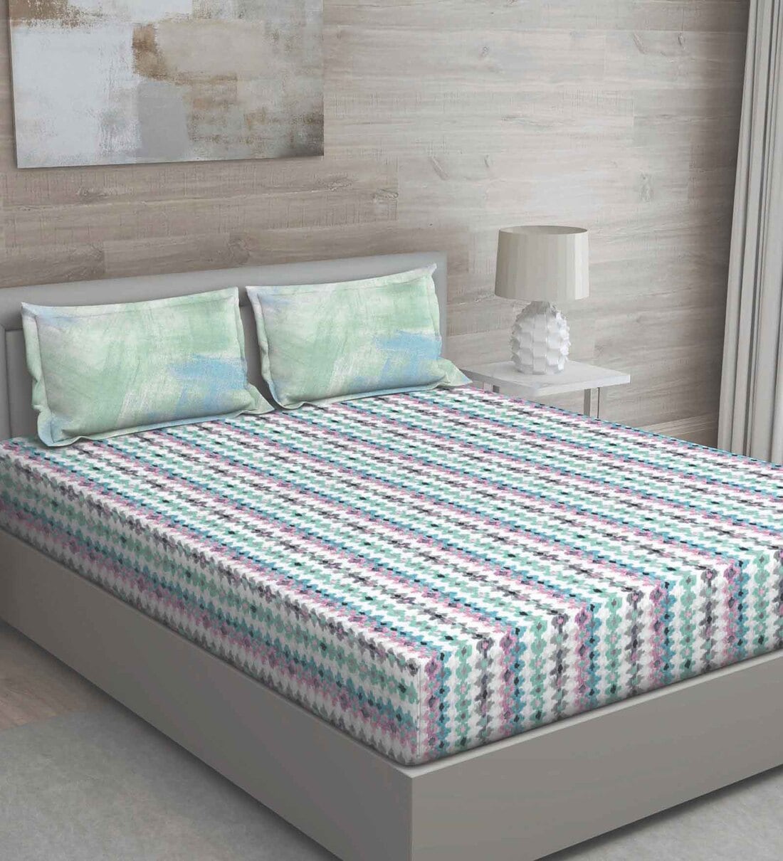 Green Abstract 150 TC Cotton Queen Sized Bed Sheets with 2 Pillow Covers