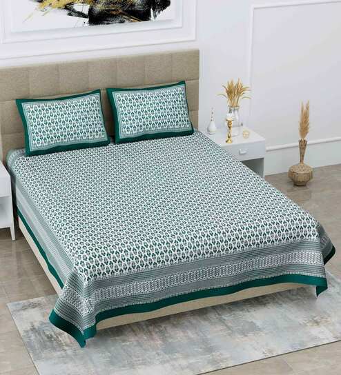 Green Traditional 108 TC Cotton King Sized Bed Sheets with 2 Pillow Covers