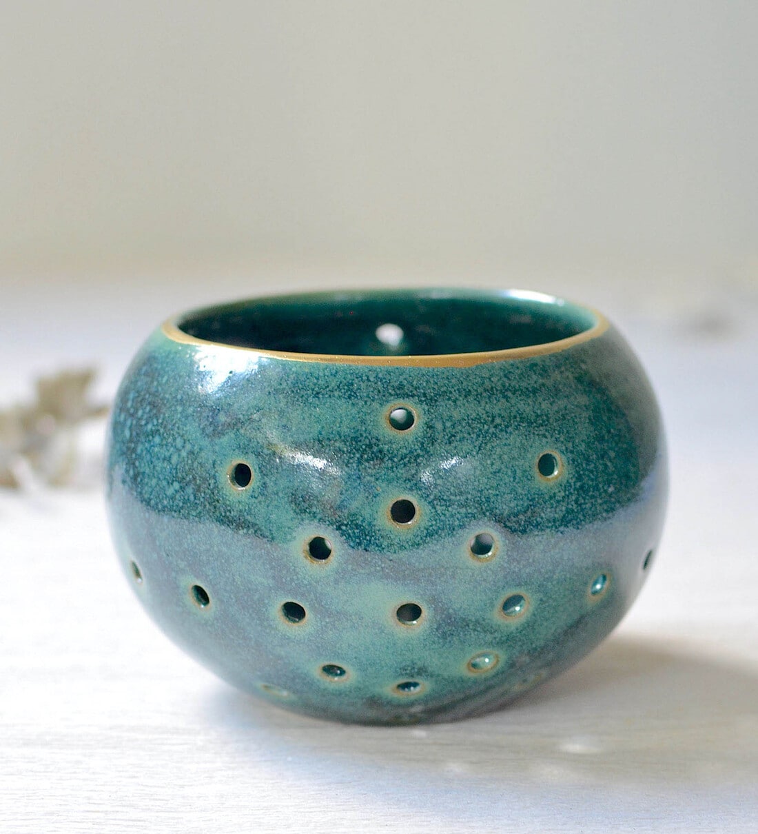 Add beautiful and unique lighting effects to your spaces with these tea light holders in artistic rich emerald glaze, full of rustic character and intricate hand cut-work.