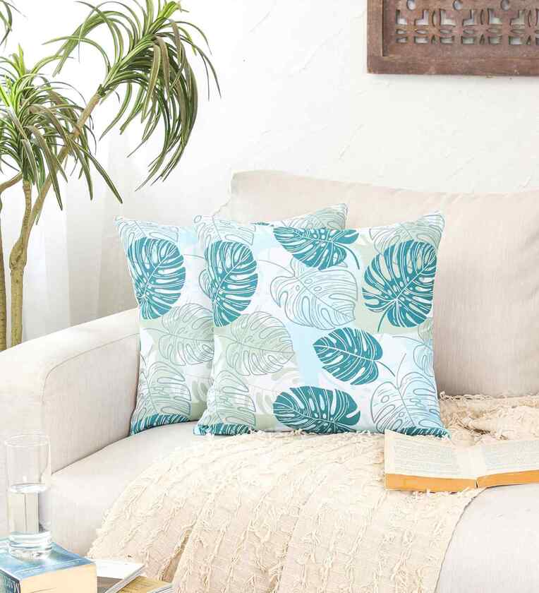 Homprin Blue & White 2 Pieces Tropical Printed Cotton Square Cushion Covers 40X40 Cms