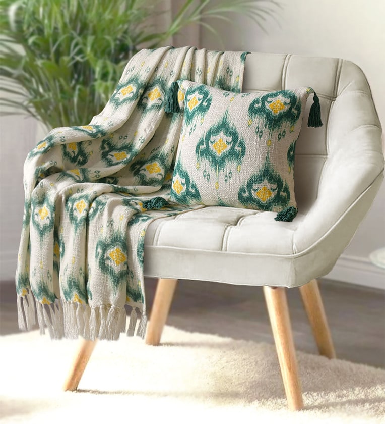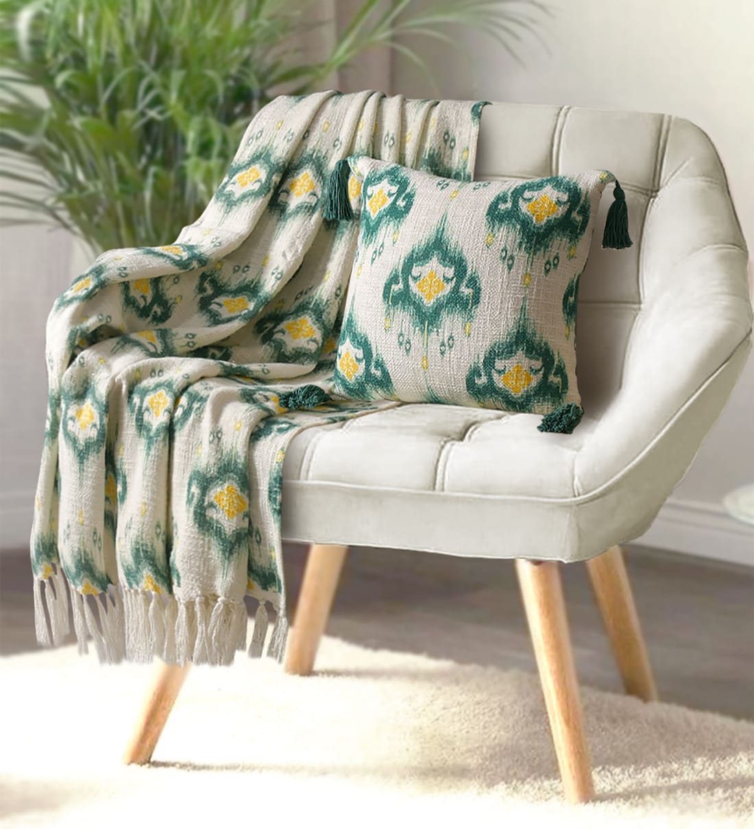 Green Cotton Printed 59x51 Inches Throw with 1 Cushion Cover